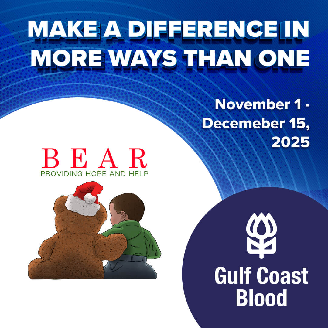 From November 1 through December 15, donors can stop by a Gulf Coast Blood donation location to: