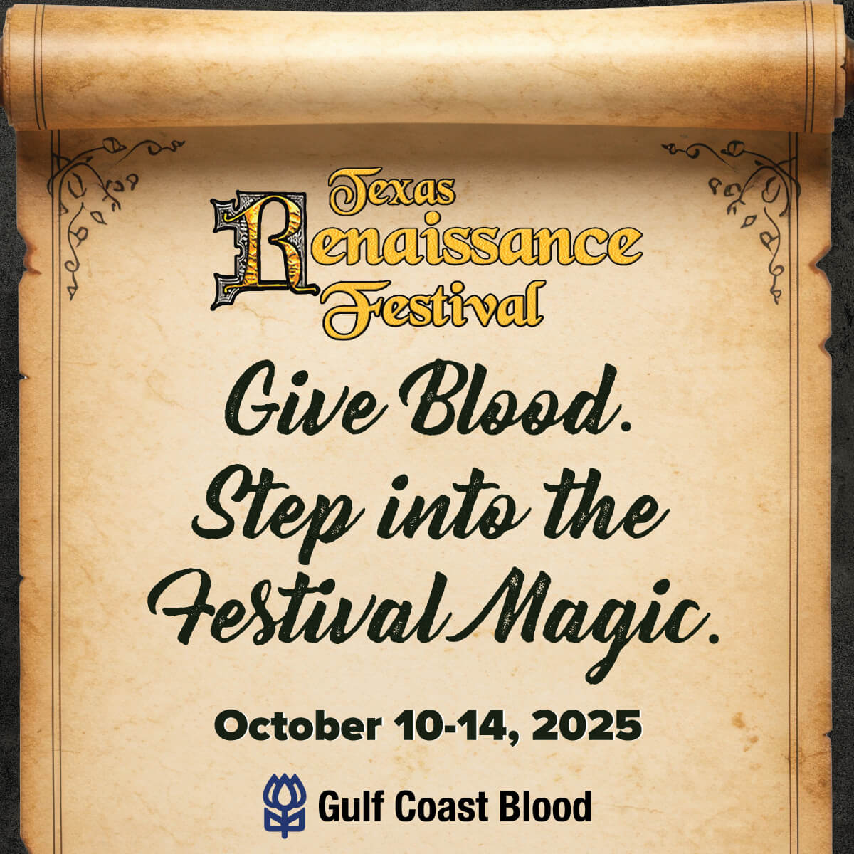 This October, you can save lives and step into a world of magic. Donate blood between October 10-14, 2025 and receive FREE admission to the Texas Renaissance Festival!